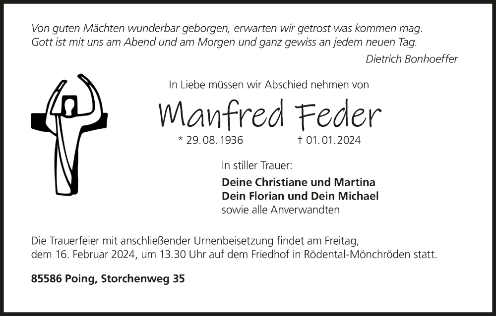 Hier finden Sie alle Traueranzeigen aus der Zeitung, die bisher für Manfred Feder erschienen sind. Weitere Traueranzeigen, die in der Zeitung erscheinen, werden hier ebenfalls aufgelistet
