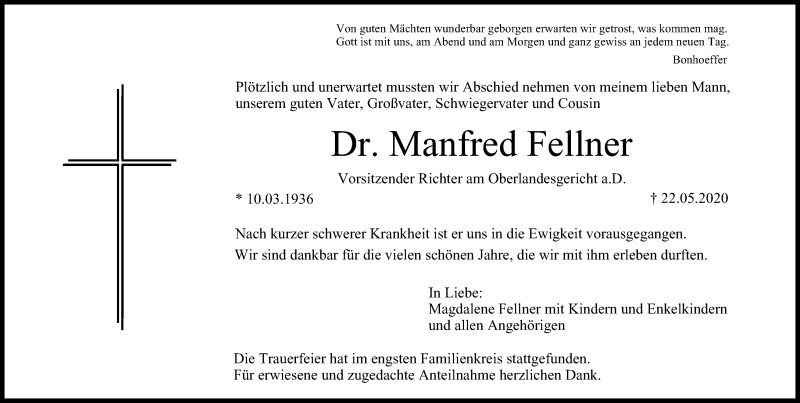 Hier finden Sie alle Traueranzeigen aus der Zeitung, die bisher für Manfred Fellner erschienen sind. Weitere Traueranzeigen, die in der Zeitung erscheinen, werden hier ebenfalls aufgelistet