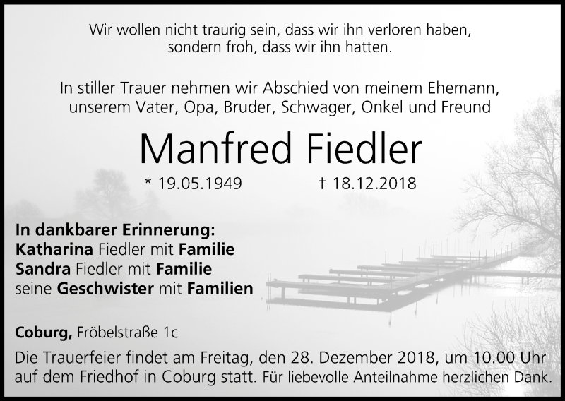 Hier finden Sie alle Traueranzeigen aus der Zeitung, die bisher für Manfred Fiedler erschienen sind. Weitere Traueranzeigen, die in der Zeitung erscheinen, werden hier ebenfalls aufgelistet