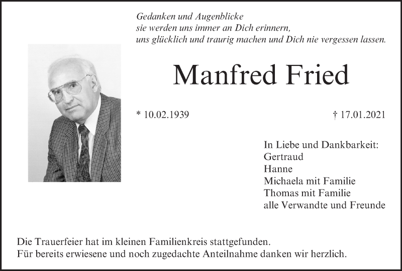 Hier finden Sie alle Traueranzeigen aus der Zeitung, die bisher für Manfred Fried erschienen sind. Weitere Traueranzeigen, die in der Zeitung erscheinen, werden hier ebenfalls aufgelistet