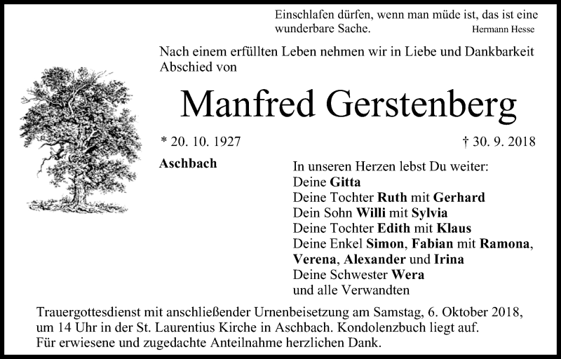 Hier finden Sie alle Traueranzeigen aus der Zeitung, die bisher für Manfred Gerstenberg erschienen sind. Weitere Traueranzeigen, die in der Zeitung erscheinen, werden hier ebenfalls aufgelistet