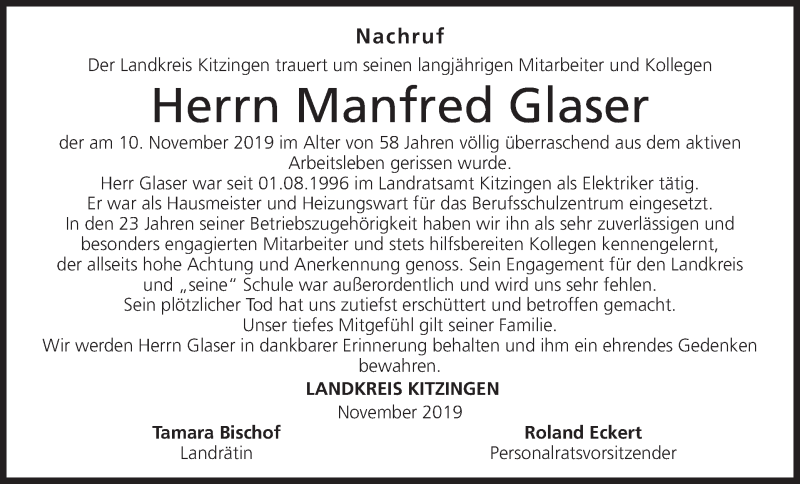 Hier finden Sie alle Traueranzeigen aus der Zeitung, die bisher für Manfred Glaser erschienen sind. Weitere Traueranzeigen, die in der Zeitung erscheinen, werden hier ebenfalls aufgelistet