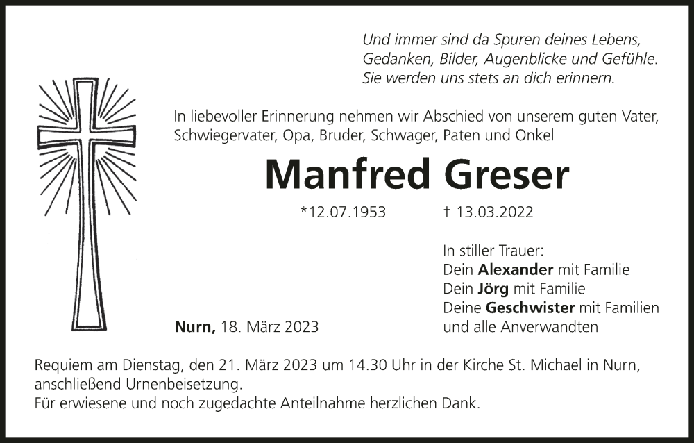 Hier finden Sie alle Traueranzeigen aus der Zeitung, die bisher für Manfred Greser erschienen sind. Weitere Traueranzeigen, die in der Zeitung erscheinen, werden hier ebenfalls aufgelistet