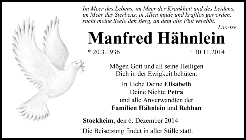 Hier finden Sie alle Traueranzeigen aus der Zeitung, die bisher für Manfred Hähnlein erschienen sind. Weitere Traueranzeigen, die in der Zeitung erscheinen, werden hier ebenfalls aufgelistet