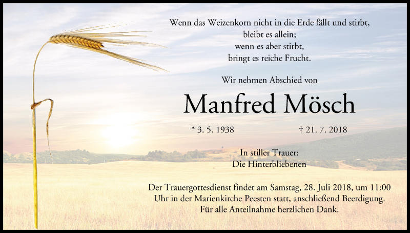 Hier finden Sie alle Traueranzeigen aus der Zeitung, die bisher für Manfred Mösch erschienen sind. Weitere Traueranzeigen, die in der Zeitung erscheinen, werden hier ebenfalls aufgelistet