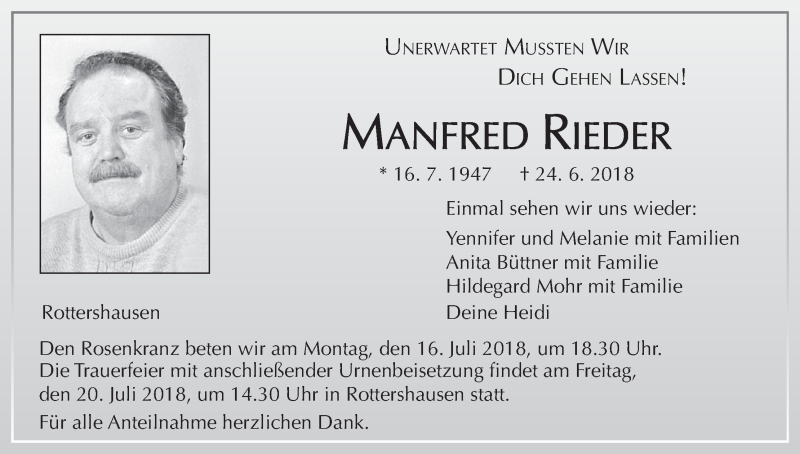 Hier finden Sie alle Traueranzeigen aus der Zeitung, die bisher für Manfred Rieder erschienen sind. Weitere Traueranzeigen, die in der Zeitung erscheinen, werden hier ebenfalls aufgelistet