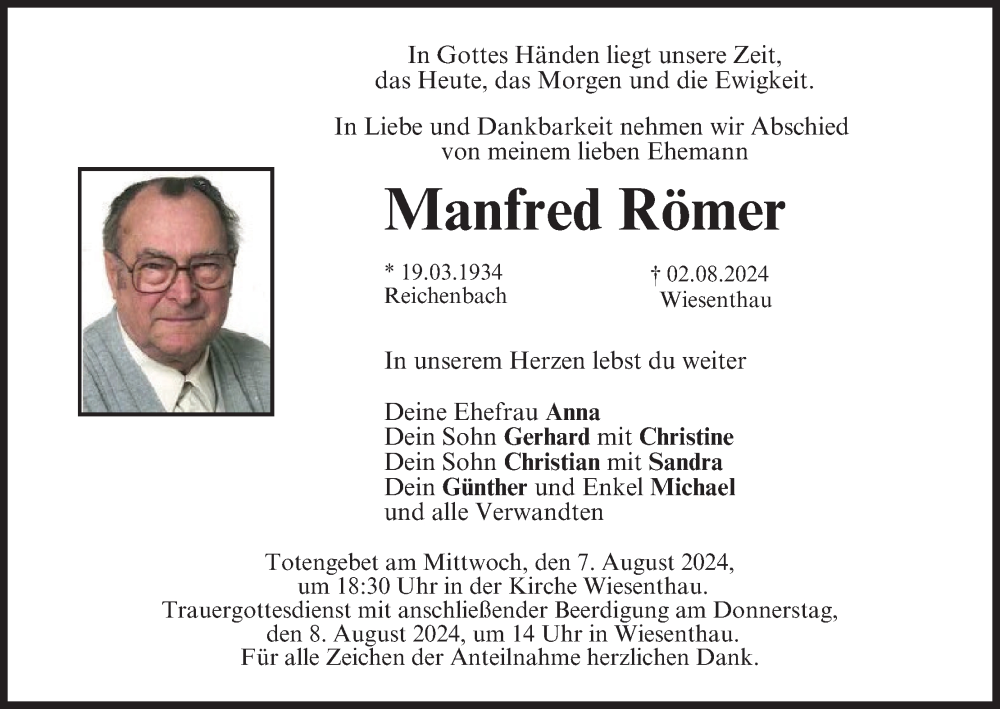Hier finden Sie alle Traueranzeigen aus der Zeitung, die bisher für Manfred Römer erschienen sind. Weitere Traueranzeigen, die in der Zeitung erscheinen, werden hier ebenfalls aufgelistet