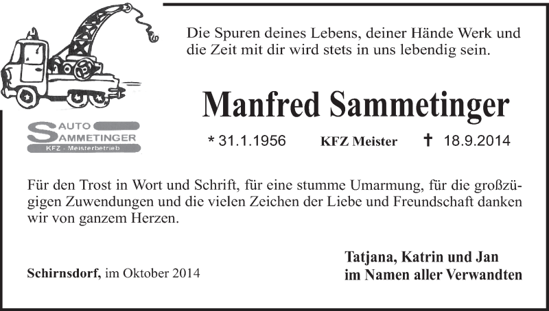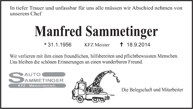 Hier finden Sie alle Traueranzeigen aus der Zeitung, die bisher für Manfred Sammetinger erschienen sind. Weitere Traueranzeigen, die in der Zeitung erscheinen, werden hier ebenfalls aufgelistet