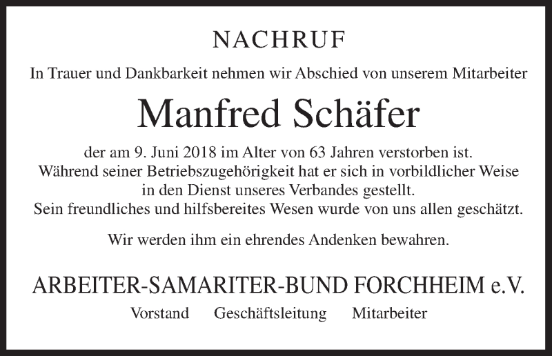 Hier finden Sie alle Traueranzeigen aus der Zeitung, die bisher für Manfred Schäfer erschienen sind. Weitere Traueranzeigen, die in der Zeitung erscheinen, werden hier ebenfalls aufgelistet