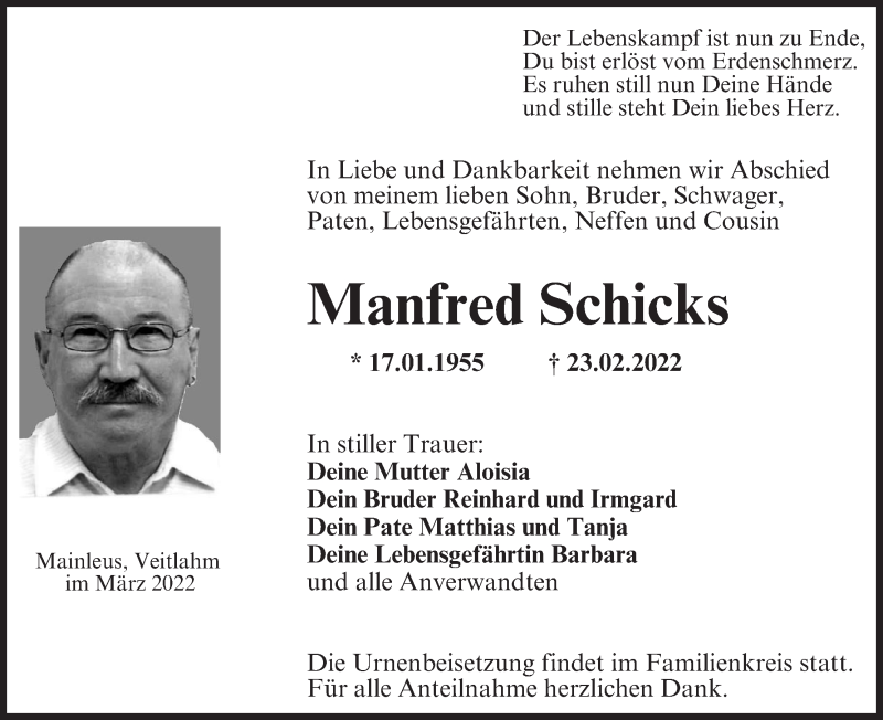 Hier finden Sie alle Traueranzeigen aus der Zeitung, die bisher für Manfred Schicks erschienen sind. Weitere Traueranzeigen, die in der Zeitung erscheinen, werden hier ebenfalls aufgelistet