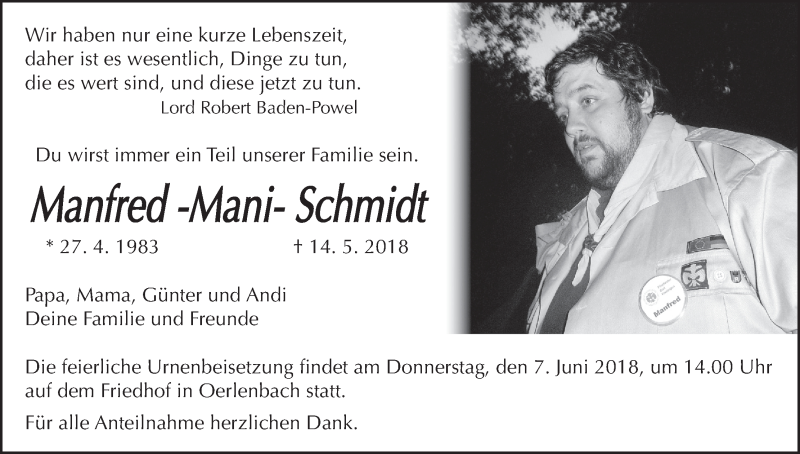 Hier finden Sie alle Traueranzeigen aus der Zeitung, die bisher für Manfred Schmidt erschienen sind. Weitere Traueranzeigen, die in der Zeitung erscheinen, werden hier ebenfalls aufgelistet