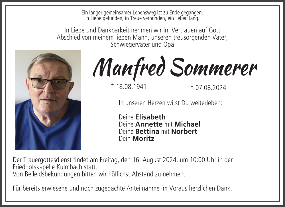 Hier finden Sie alle Traueranzeigen aus der Zeitung, die bisher für Manfred Sommerer erschienen sind. Weitere Traueranzeigen, die in der Zeitung erscheinen, werden hier ebenfalls aufgelistet