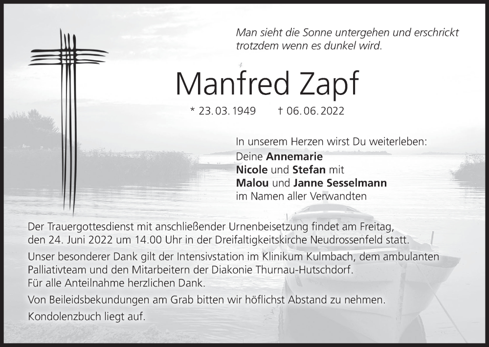 Hier finden Sie alle Traueranzeigen aus der Zeitung, die bisher für Manfred Zapf erschienen sind. Weitere Traueranzeigen, die in der Zeitung erscheinen, werden hier ebenfalls aufgelistet