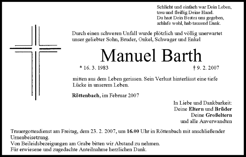 Hier finden Sie alle Traueranzeigen aus der Zeitung, die bisher für Manuel Barth erschienen sind. Weitere Traueranzeigen, die in der Zeitung erscheinen, werden hier ebenfalls aufgelistet