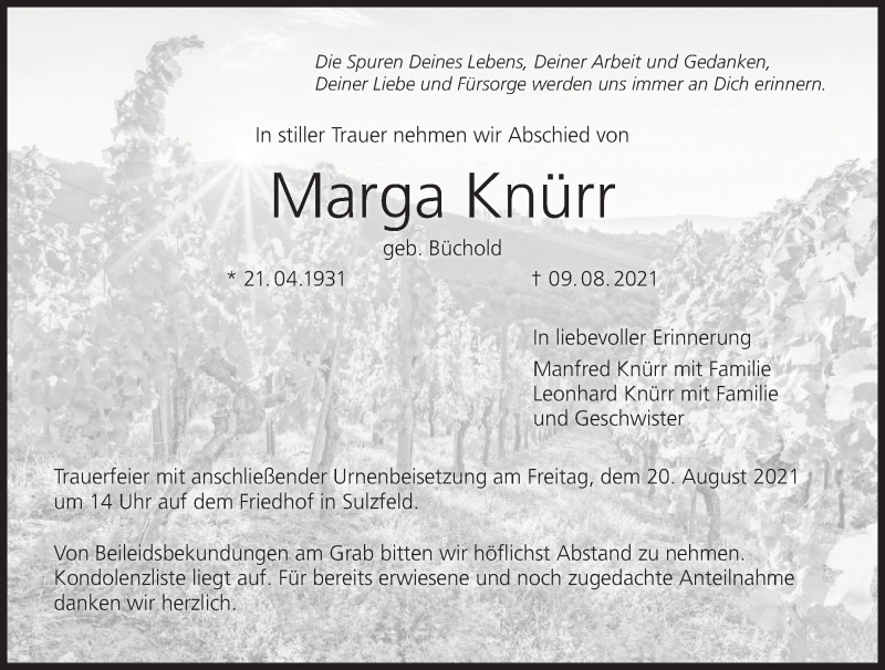 Hier finden Sie alle Traueranzeigen aus der Zeitung, die bisher für Marga Knürr erschienen sind. Weitere Traueranzeigen, die in der Zeitung erscheinen, werden hier ebenfalls aufgelistet
