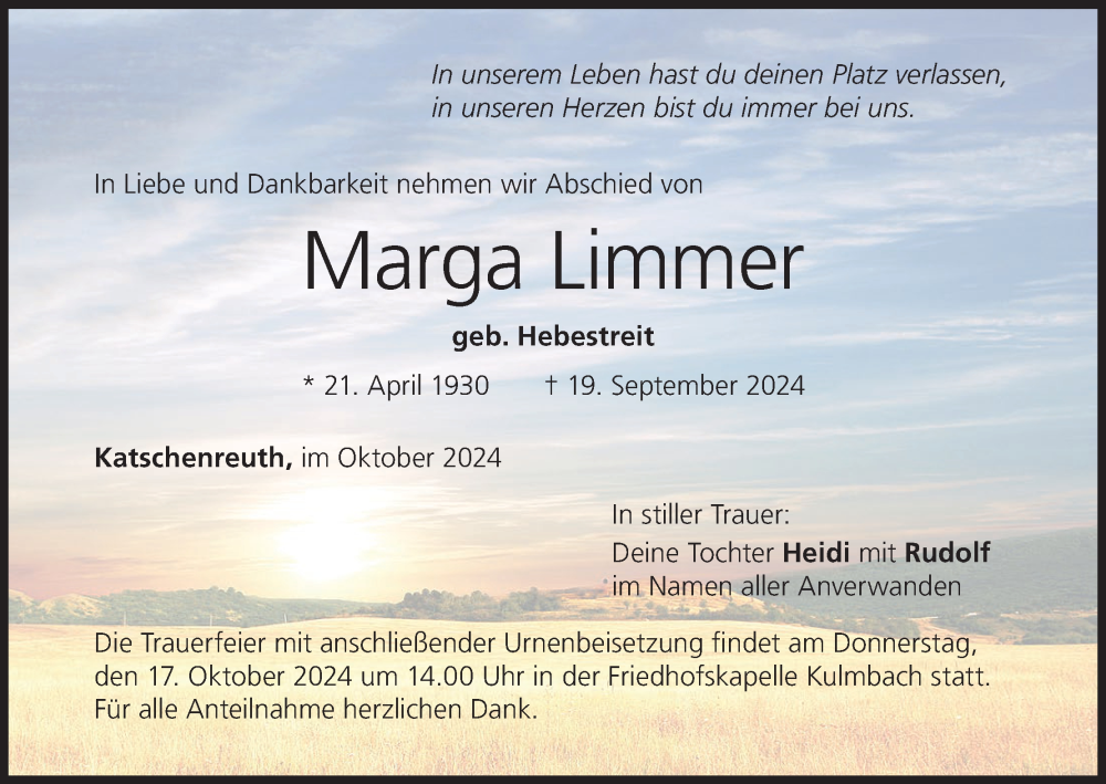 Hier finden Sie alle Traueranzeigen aus der Zeitung, die bisher für Marga Limmer erschienen sind. Weitere Traueranzeigen, die in der Zeitung erscheinen, werden hier ebenfalls aufgelistet