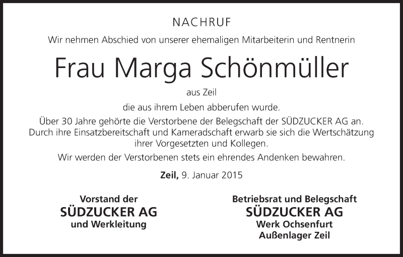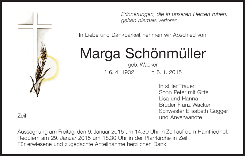 Hier finden Sie alle Traueranzeigen aus der Zeitung, die bisher für Marga Schönmüller erschienen sind. Weitere Traueranzeigen, die in der Zeitung erscheinen, werden hier ebenfalls aufgelistet