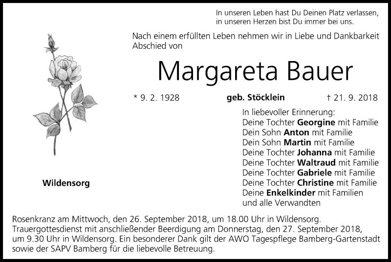 Hier finden Sie alle Traueranzeigen aus der Zeitung, die bisher für Margareta Bauer erschienen sind. Weitere Traueranzeigen, die in der Zeitung erscheinen, werden hier ebenfalls aufgelistet