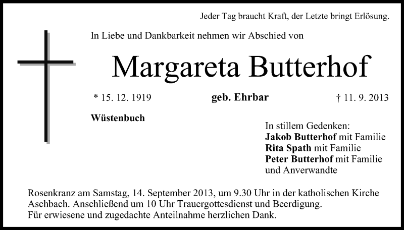 Hier finden Sie alle Traueranzeigen aus der Zeitung, die bisher für Margareta Butterhof erschienen sind. Weitere Traueranzeigen, die in der Zeitung erscheinen, werden hier ebenfalls aufgelistet