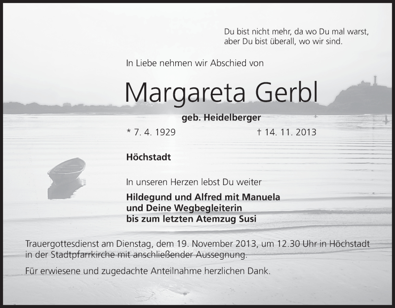 Hier finden Sie alle Traueranzeigen aus der Zeitung, die bisher für Margareta Gerbl erschienen sind. Weitere Traueranzeigen, die in der Zeitung erscheinen, werden hier ebenfalls aufgelistet