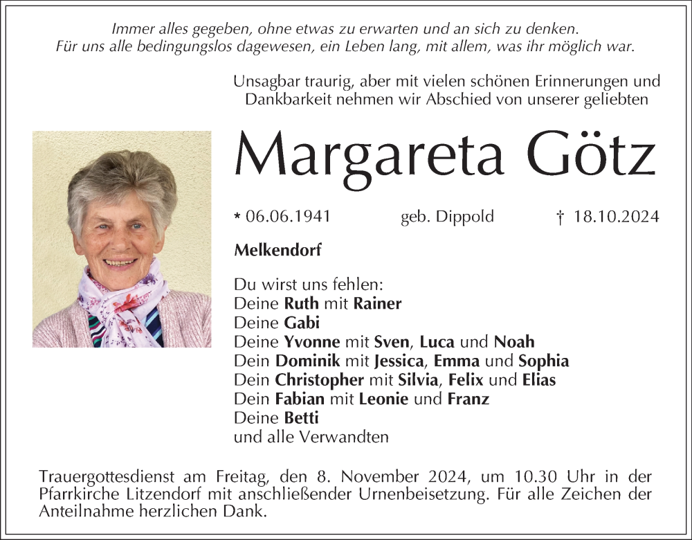 Hier finden Sie alle Traueranzeigen aus der Zeitung, die bisher für Margareta Götz erschienen sind. Weitere Traueranzeigen, die in der Zeitung erscheinen, werden hier ebenfalls aufgelistet