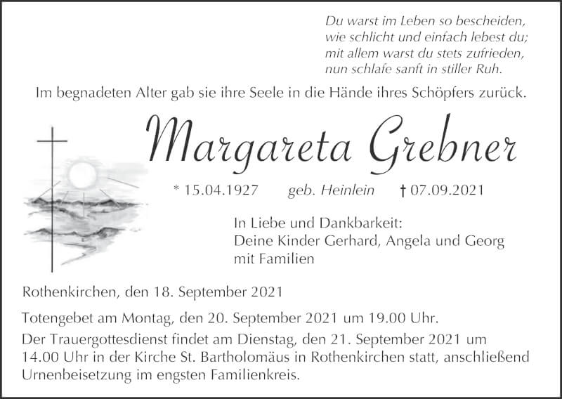 Hier finden Sie alle Traueranzeigen aus der Zeitung, die bisher für Margareta Grebner erschienen sind. Weitere Traueranzeigen, die in der Zeitung erscheinen, werden hier ebenfalls aufgelistet