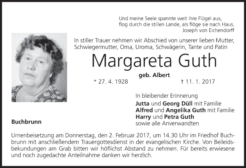 Hier finden Sie alle Traueranzeigen aus der Zeitung, die bisher für Margareta Guth erschienen sind. Weitere Traueranzeigen, die in der Zeitung erscheinen, werden hier ebenfalls aufgelistet