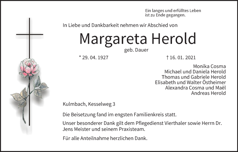 Hier finden Sie alle Traueranzeigen aus der Zeitung, die bisher für Margareta Herold erschienen sind. Weitere Traueranzeigen, die in der Zeitung erscheinen, werden hier ebenfalls aufgelistet