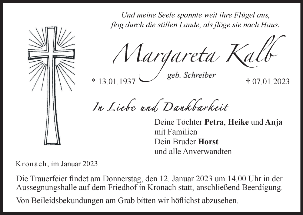Hier finden Sie alle Traueranzeigen aus der Zeitung, die bisher für Margareta Kalb erschienen sind. Weitere Traueranzeigen, die in der Zeitung erscheinen, werden hier ebenfalls aufgelistet