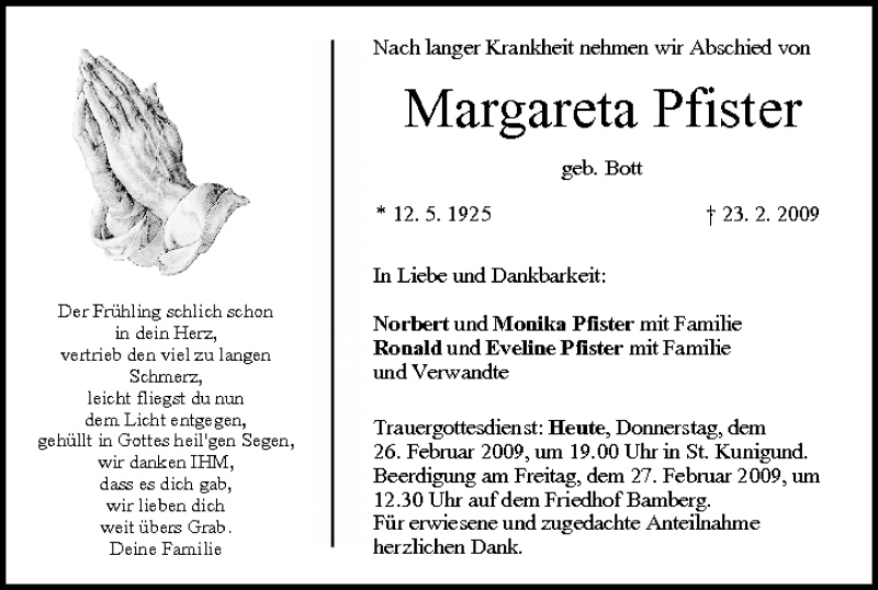 Hier finden Sie alle Traueranzeigen aus der Zeitung, die bisher für Margareta Pfister erschienen sind. Weitere Traueranzeigen, die in der Zeitung erscheinen, werden hier ebenfalls aufgelistet