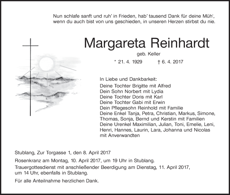 Hier finden Sie alle Traueranzeigen aus der Zeitung, die bisher für Margareta Reinhardt erschienen sind. Weitere Traueranzeigen, die in der Zeitung erscheinen, werden hier ebenfalls aufgelistet