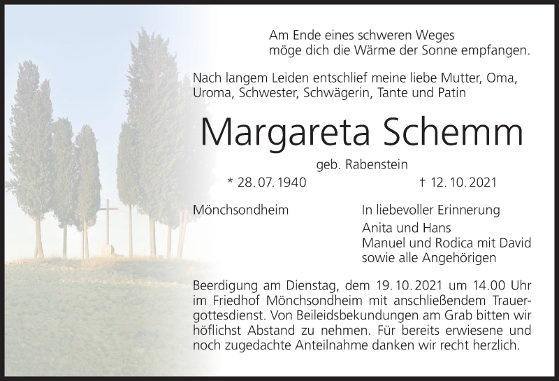 Hier finden Sie alle Traueranzeigen aus der Zeitung, die bisher für Margareta Schemm erschienen sind. Weitere Traueranzeigen, die in der Zeitung erscheinen, werden hier ebenfalls aufgelistet