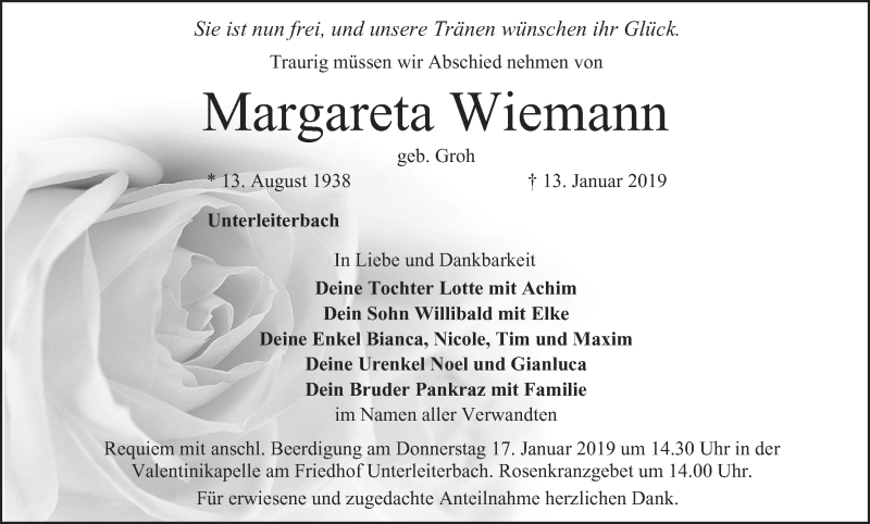 Hier finden Sie alle Traueranzeigen aus der Zeitung, die bisher für Margareta Wiemann erschienen sind. Weitere Traueranzeigen, die in der Zeitung erscheinen, werden hier ebenfalls aufgelistet