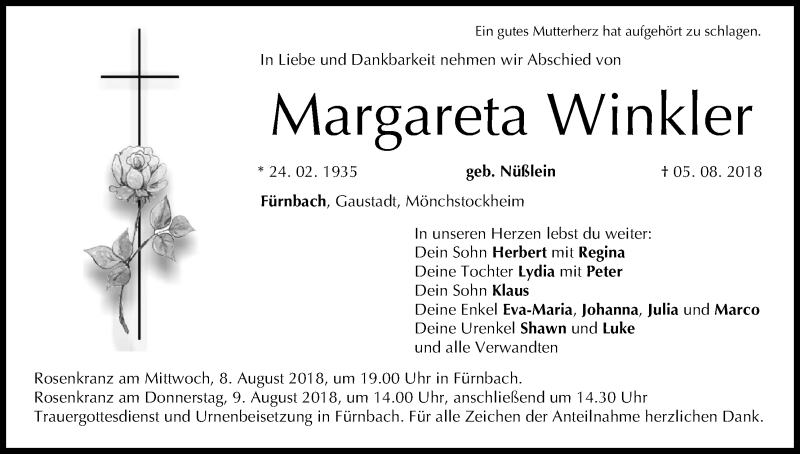 Hier finden Sie alle Traueranzeigen aus der Zeitung, die bisher für Margareta Winkler erschienen sind. Weitere Traueranzeigen, die in der Zeitung erscheinen, werden hier ebenfalls aufgelistet