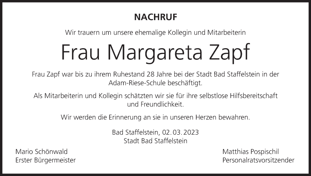 Hier finden Sie alle Traueranzeigen aus der Zeitung, die bisher für Margareta Zapf erschienen sind. Weitere Traueranzeigen, die in der Zeitung erscheinen, werden hier ebenfalls aufgelistet