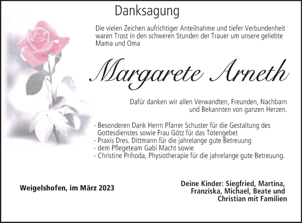 Hier finden Sie alle Traueranzeigen aus der Zeitung, die bisher für Margarete Arneth erschienen sind. Weitere Traueranzeigen, die in der Zeitung erscheinen, werden hier ebenfalls aufgelistet
