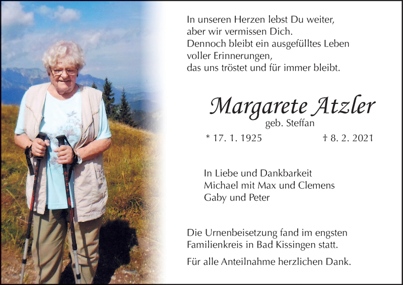 Hier finden Sie alle Traueranzeigen aus der Zeitung, die bisher für Margarete Atzler erschienen sind. Weitere Traueranzeigen, die in der Zeitung erscheinen, werden hier ebenfalls aufgelistet