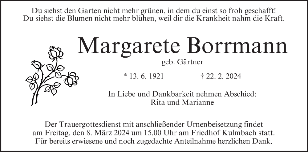 Hier finden Sie alle Traueranzeigen aus der Zeitung, die bisher für Margarete Borrmann erschienen sind. Weitere Traueranzeigen, die in der Zeitung erscheinen, werden hier ebenfalls aufgelistet