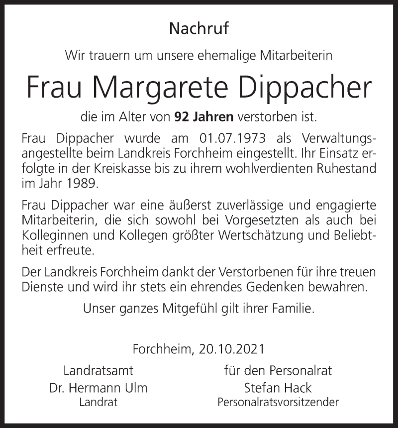 Hier finden Sie alle Traueranzeigen aus der Zeitung, die bisher für Margarete Dippacher erschienen sind. Weitere Traueranzeigen, die in der Zeitung erscheinen, werden hier ebenfalls aufgelistet