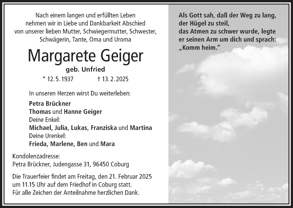 Hier finden Sie alle Traueranzeigen aus der Zeitung, die bisher für Margarete Geiger erschienen sind. Weitere Traueranzeigen, die in der Zeitung erscheinen, werden hier ebenfalls aufgelistet