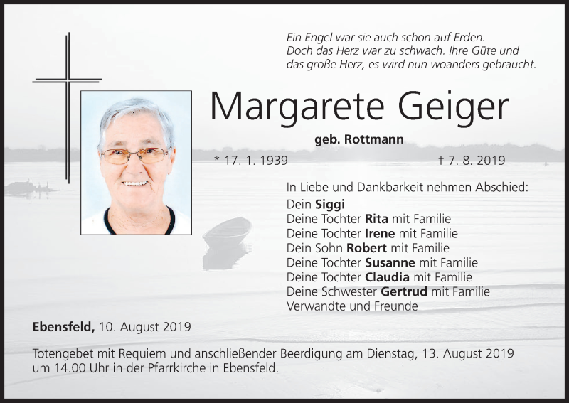 Hier finden Sie alle Traueranzeigen aus der Zeitung, die bisher für Margarete Geiger erschienen sind. Weitere Traueranzeigen, die in der Zeitung erscheinen, werden hier ebenfalls aufgelistet