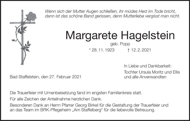 Hier finden Sie alle Traueranzeigen aus der Zeitung, die bisher für Margarete Hagelstein erschienen sind. Weitere Traueranzeigen, die in der Zeitung erscheinen, werden hier ebenfalls aufgelistet