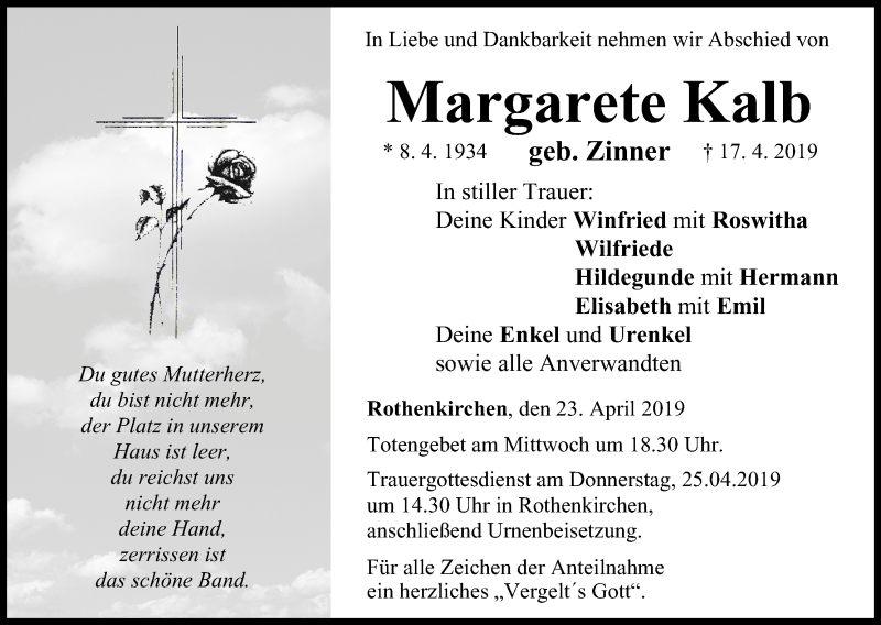 Hier finden Sie alle Traueranzeigen aus der Zeitung, die bisher für Margarete Kalb erschienen sind. Weitere Traueranzeigen, die in der Zeitung erscheinen, werden hier ebenfalls aufgelistet