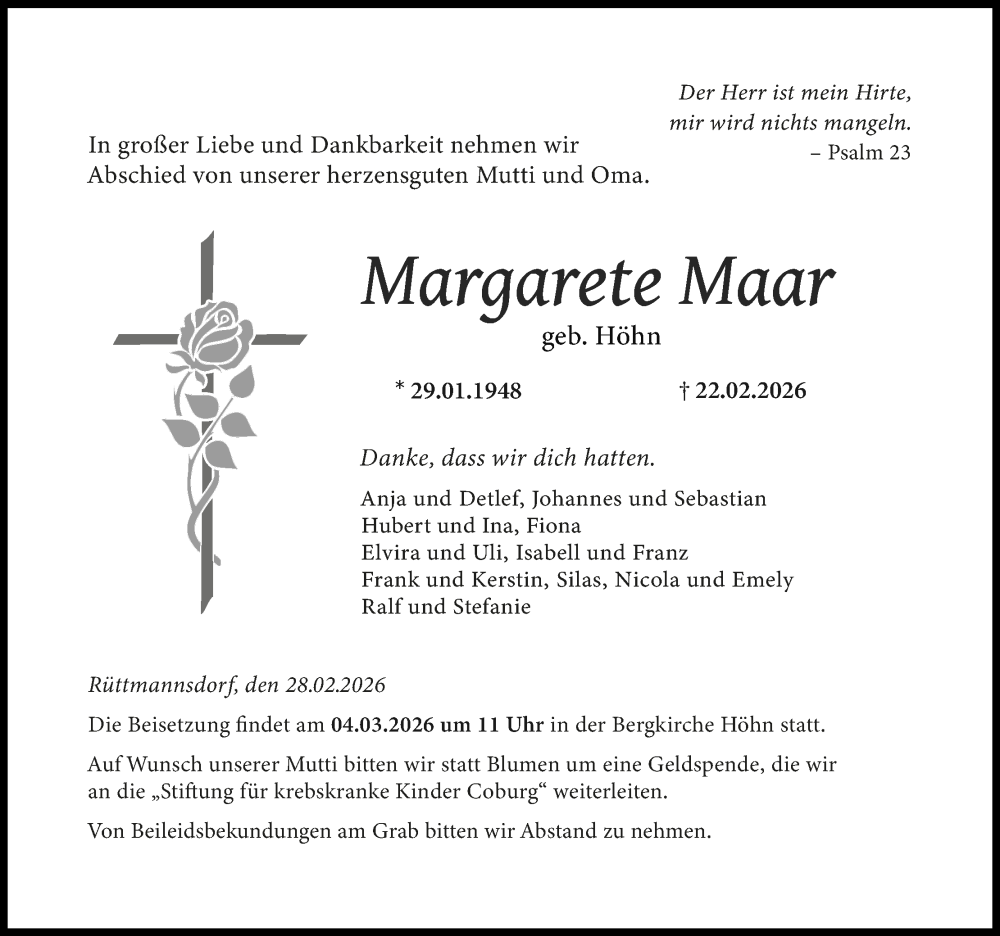 Hier finden Sie alle Traueranzeigen aus der Zeitung, die bisher für Margarete Maar erschienen sind. Weitere Traueranzeigen, die in der Zeitung erscheinen, werden hier ebenfalls aufgelistet