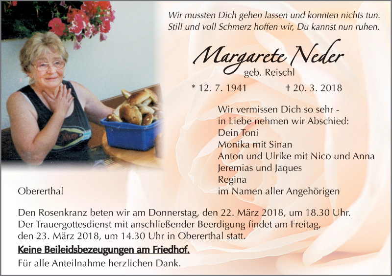 Hier finden Sie alle Traueranzeigen aus der Zeitung, die bisher für Margarete Neder erschienen sind. Weitere Traueranzeigen, die in der Zeitung erscheinen, werden hier ebenfalls aufgelistet