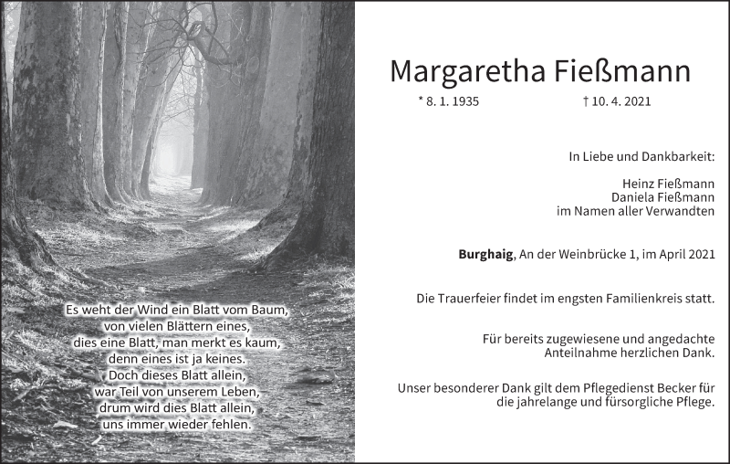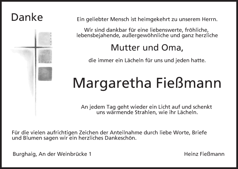 Hier finden Sie alle Traueranzeigen aus der Zeitung, die bisher für Margaretha Fießmann erschienen sind. Weitere Traueranzeigen, die in der Zeitung erscheinen, werden hier ebenfalls aufgelistet