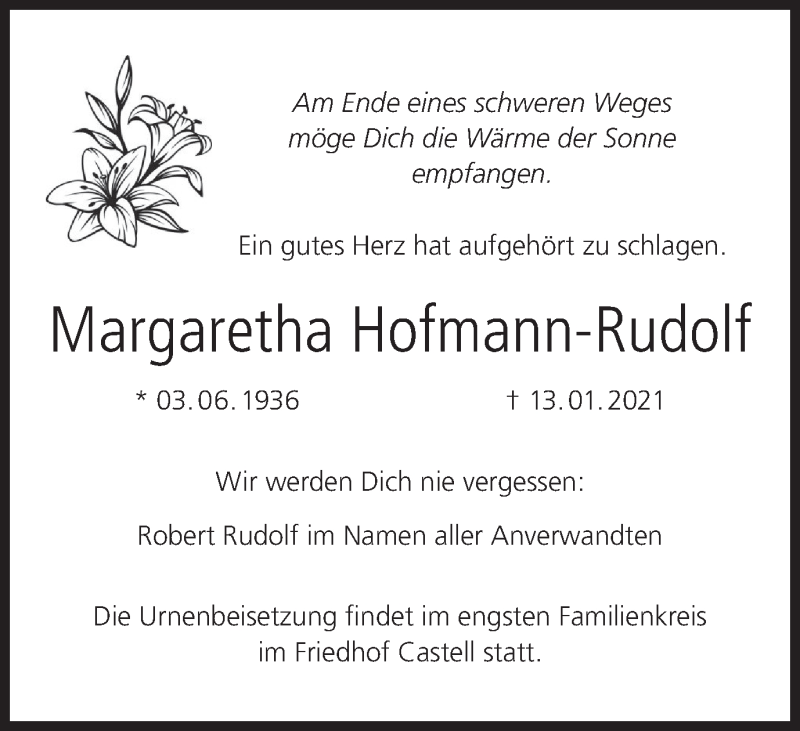Hier finden Sie alle Traueranzeigen aus der Zeitung, die bisher für Margaretha Hofmann-Rudolf erschienen sind. Weitere Traueranzeigen, die in der Zeitung erscheinen, werden hier ebenfalls aufgelistet