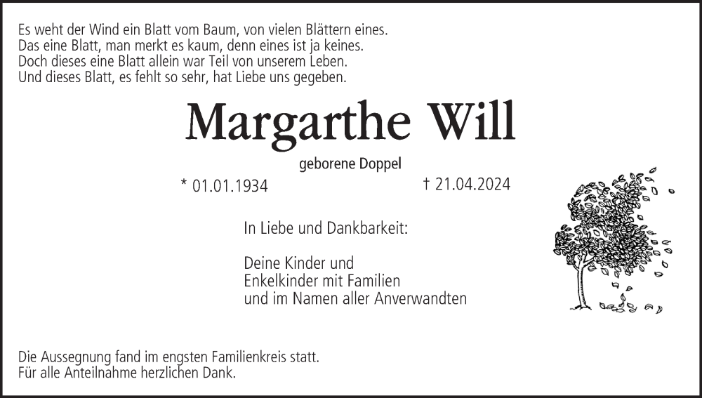 Hier finden Sie alle Traueranzeigen aus der Zeitung, die bisher für Margarthe Will erschienen sind. Weitere Traueranzeigen, die in der Zeitung erscheinen, werden hier ebenfalls aufgelistet