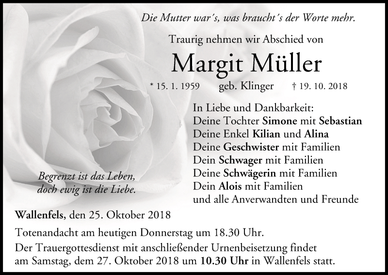 Hier finden Sie alle Traueranzeigen aus der Zeitung, die bisher für Margit Müller erschienen sind. Weitere Traueranzeigen, die in der Zeitung erscheinen, werden hier ebenfalls aufgelistet