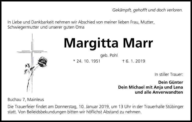 Hier finden Sie alle Traueranzeigen aus der Zeitung, die bisher für Margitta Marr erschienen sind. Weitere Traueranzeigen, die in der Zeitung erscheinen, werden hier ebenfalls aufgelistet